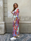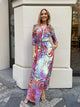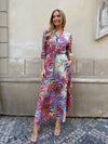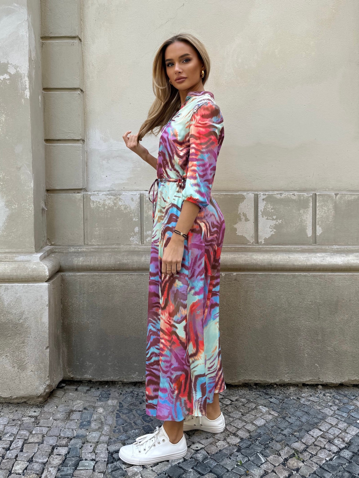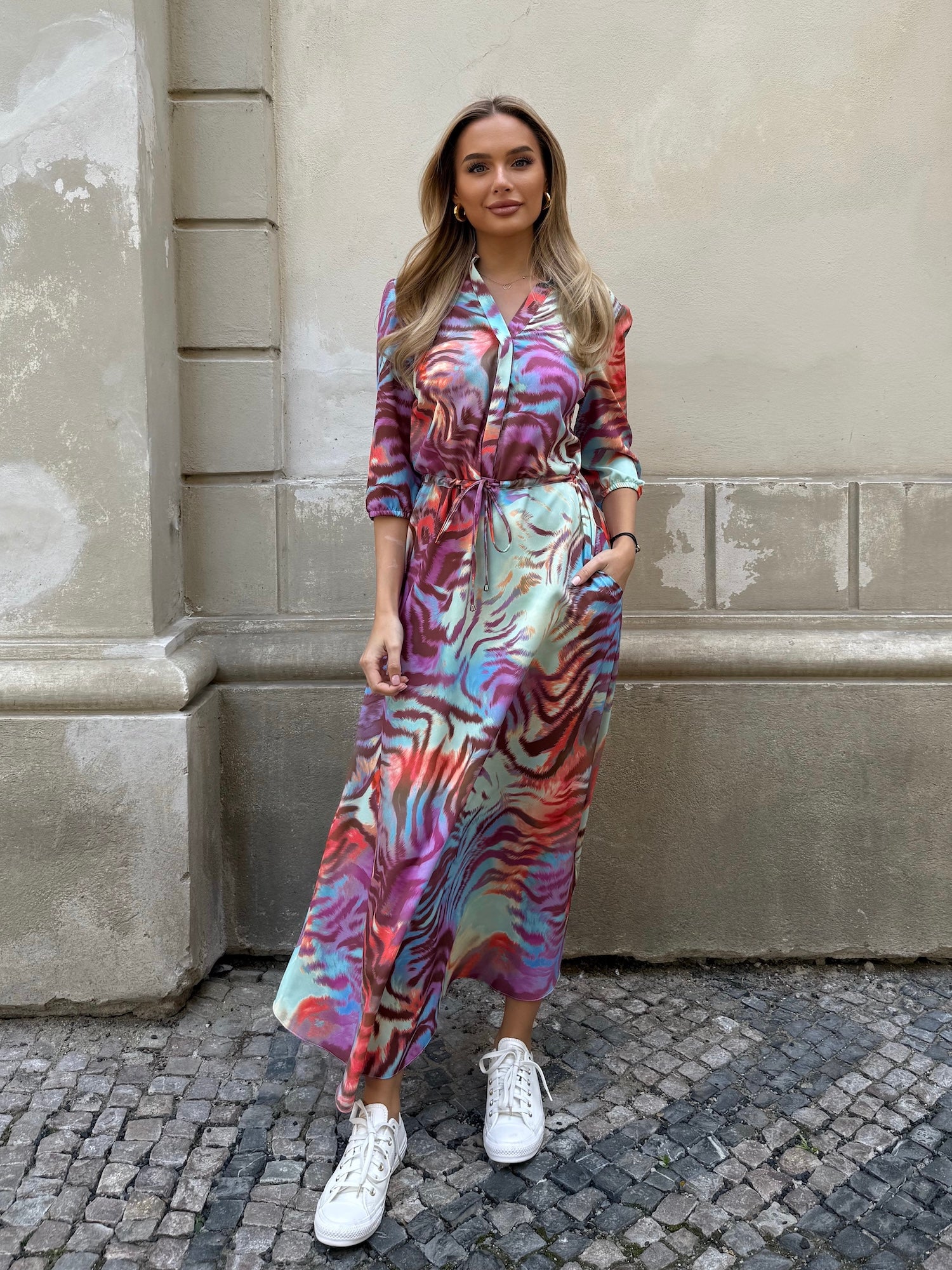 Ženské, výrazné a neodolatelně hravé – tyto šaty přináší explozi barev v originálním abstraktním potisku. Kombinace fialové, tyrkysové, červené a béžové tvoří svěží look, který rozzáří každou příležitost. Volný, splývavý střih se zavazováním v pase lichotí postavě, zatímco příjemný materiál zaručí celodenní komfort. Ideální volba pro módní sebevědomou ženu ve městě.